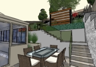 Summary: Garden design for a steeply sloping circa 11m x 11m back garden, associated with a house extensionLocation: Surrey/Hampshire borders