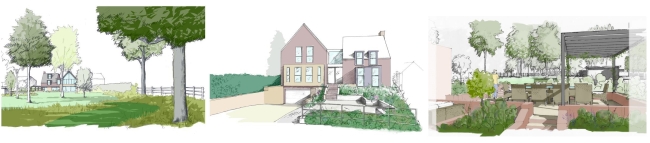 The principal features in the rear garden are the patios and swimming pool. The pool is sited to take advantage of the best afternoon sun, away from the shadow cast by the house, but also set to one side of the principal views from the main living areas (a pool can be a dreary sight during the winter months!). A pool house not only provides a sheltered sitting and changing area, but serves as a visual backdrop. The pool machinery is sited behind the pool house, taking advantage of the accoustic screening the building provides.